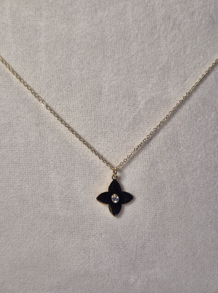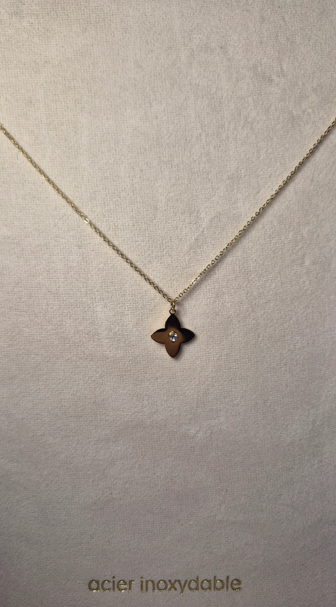 Laissez-vous séduire par la finesse de ce collier au charme intemporel. Son pendentif en forme de fleur à quatre pétales, entièrement doré, est sublimé par un scintillant en son centre, apportant une touche de lumière subtile à votre décolleté.