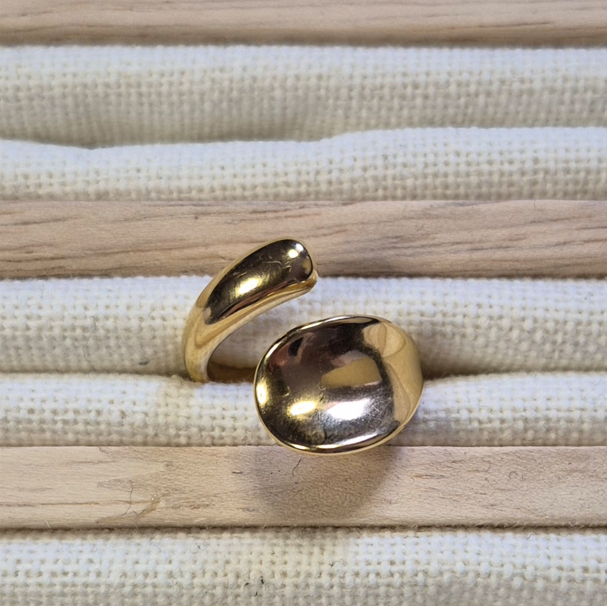 Élégante et contemporaine, cette bague dorée en acier inoxydable séduit par son design ouvert et minimaliste. Sa forme unique, avec une extrémité légèrement bombée et une autre affinée, crée un équilibre parfait entre modernité et sophistication.