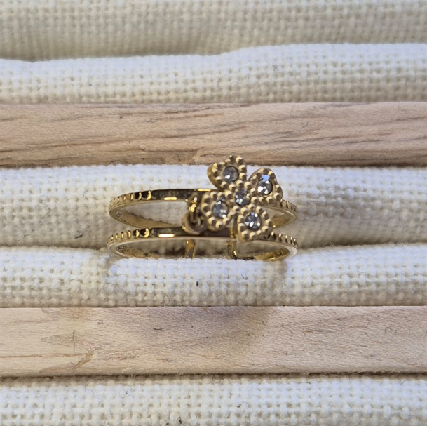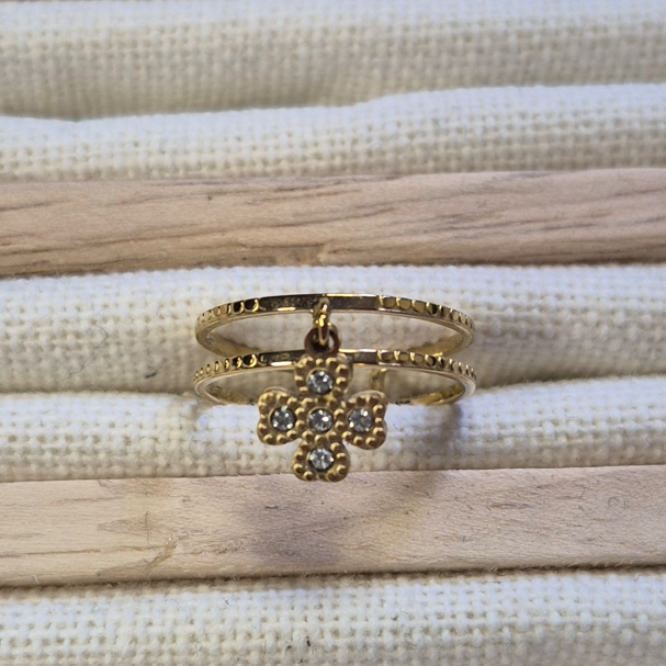 Élégante et raffinée, cette bague dorée se distingue par son design double anneau délicatement texturé et son motif trèfle mobile orné de petits cristaux scintillants. Le trèfle, symbole de chance et d’harmonie, apporte une touche à la fois romantique et intemporelle.
