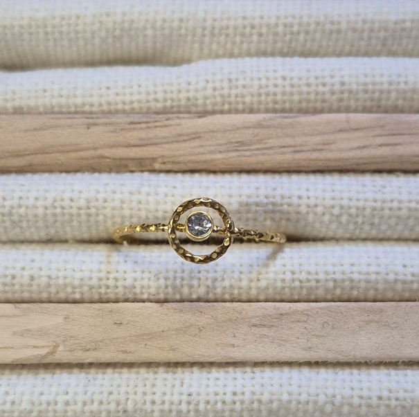 Cette bague dorée se distingue par son anneau fin à effet martelé et son cercle central ajouré, orné d’un cristal scintillant au centre. Un design minimaliste plein de charme.