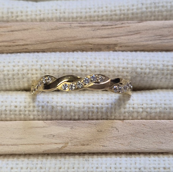 Son motif délicatement torsadé crée un jeu de courbes harmonieuses qui symbolisent l’union et l’équilibre. Les petits zircons scintillants sont sertis avec précision pour offrir une brillance subtile et raffinée.