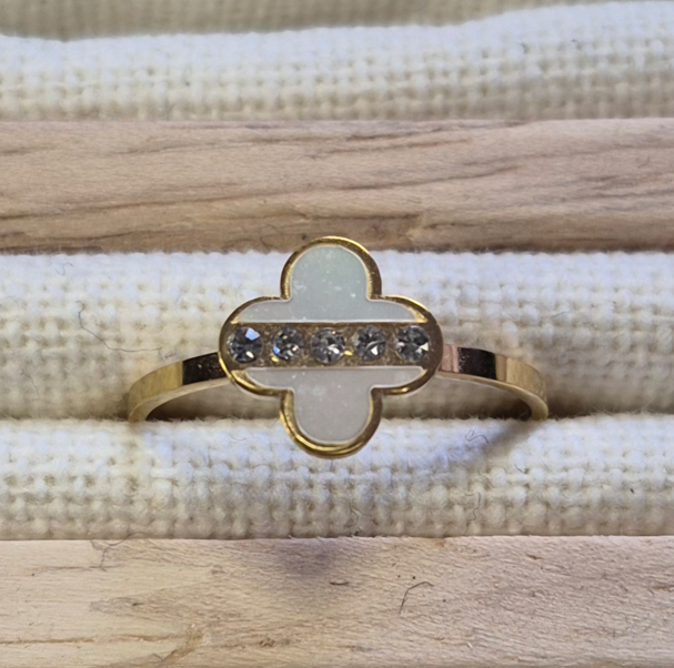 Ornée d’un motif trèfle blanc nacré, traversé par une fine ligne de brillants scintillants, cette bague allie pureté et éclat. Son contraste délicat entre le doré et le blanc lui confère une allure chic et lumineuse.