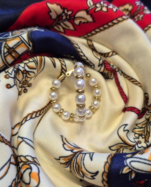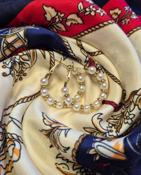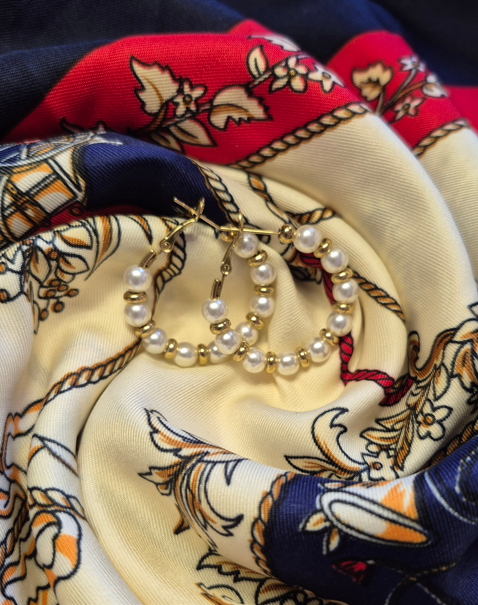 Ces créoles dorées sont entièrement ornées de perles nacrées, pour un rendu lumineux et féminin. Chaque perle est soigneusement disposée pour créer un équilibre parfait entre douceur et sophistication.