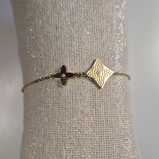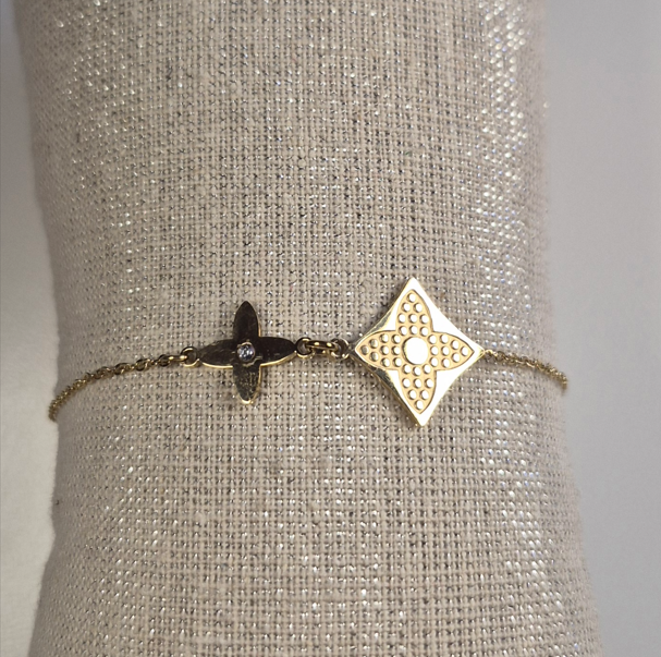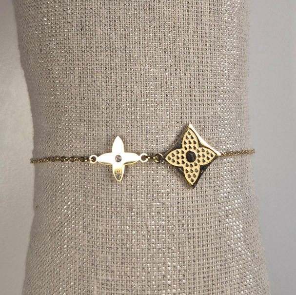 Ce bracelet délicat en acier inoxydable doré associe subtilement deux motifs floraux : une fleur dorée texturée et une étoile dorée ornée d’une petite pierre scintillant. L’équilibre parfait entre brillance et modernité en fait un bijou à la fois chic et intemporel, idéal pour compléter toutes vos tenues.