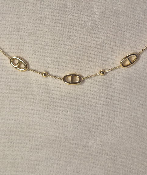 Collier doré en acier inoxydable. Son design délicat associe de petites mailles ovales ajourées à de fines perles dorées pour un rendu élégant et raffiné.