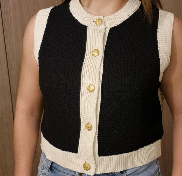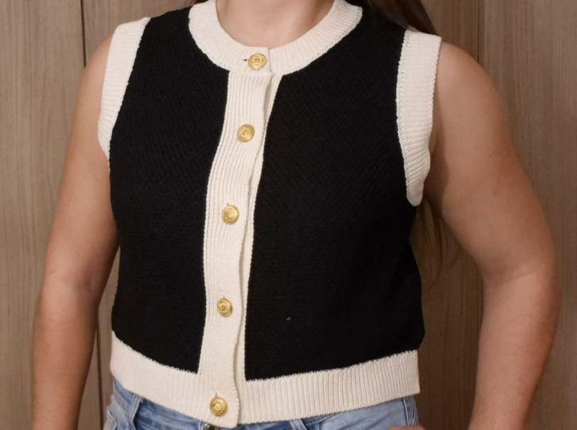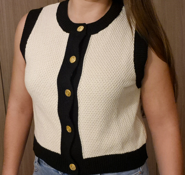 Ce gilet chic bicolore allie élégance et modernité avec sa base noire rehaussée de finitions écrues contrastantes. Sa coupe droite et légèrement ample lui confère un tombé structuré et confortable, idéal à porter seul ou sur un chemisier.