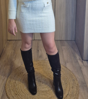 Ses deux fausses poches à l’avant, ornées de boutons bijoux dorés, ajoutent une note sophistiquée et féminine. Idéale pour un look d’hiver élégant, cette jupe se marie parfaitement avec un pull col roulé ou une blouse fluide, accompagnée de bottes hautes ou d’escarpins.