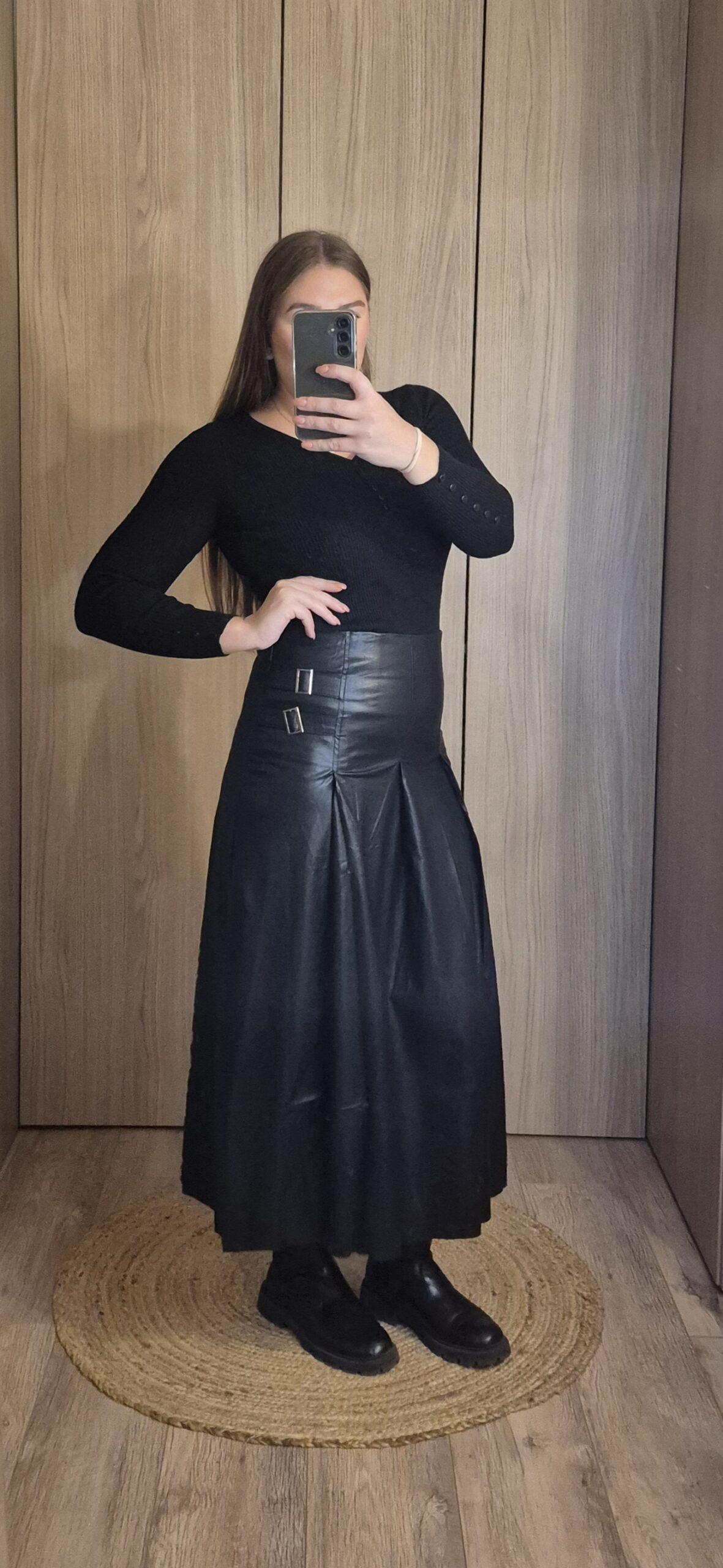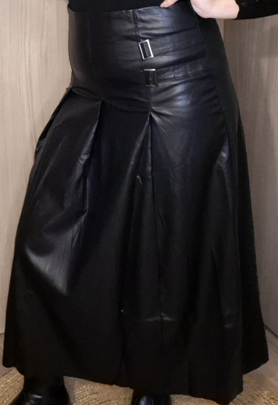 Cette jupe midi en simili cuir noir allie élégance et audace pour un look féminin et contemporain. Sa coupe évasée met en valeur la silhouette tout en offrant un confort optimal grâce à sa matière souple et légèrement satinée. Le design se distingue par de larges plis structurés à l’avant et à l’arrière, apportant du mouvement et du volume à la jupe.