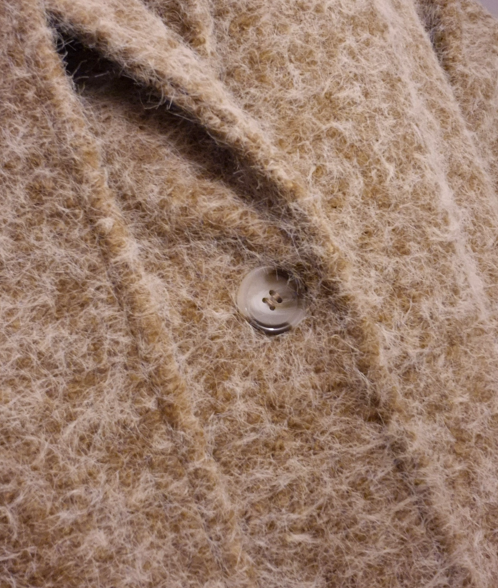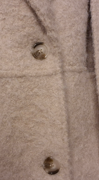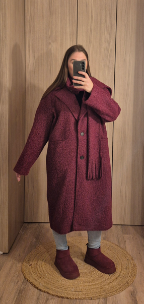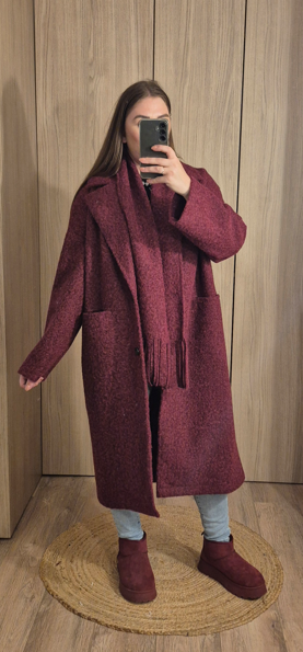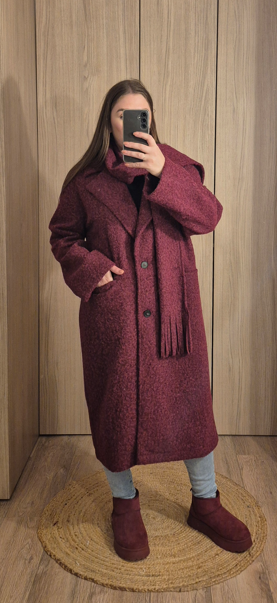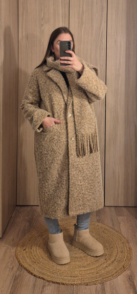 Manteau long en tissu bouclette effet laine, avec col tailleur et poches sur les côtés. Avec écharpe.