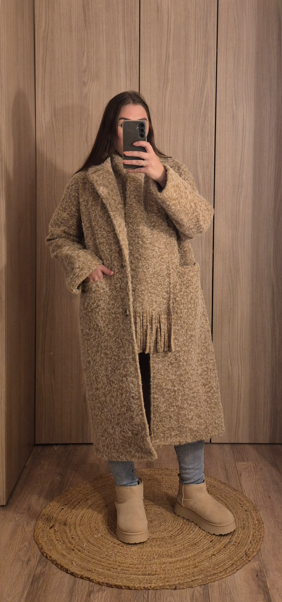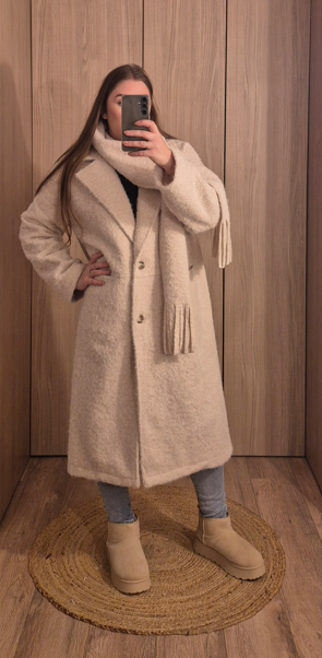 Son design épuré est sublimé par une écharpe intégrée à franges, ajoutant une touche raffinée et pratique pour se protéger du froid sans effort. Sa coupe droite légèrement oversize permet de le porter facilement sur un pull ou un blazer, tout en restant confortable et féminin.