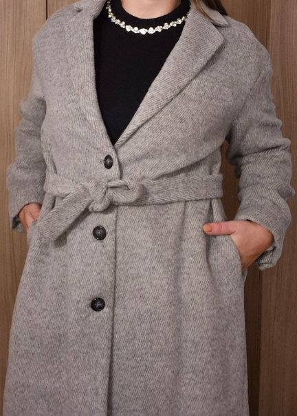 Manteau long à la coupe droite et structurée. Col à revers classique, fermeture à boutons et ceinture ton sur ton à nouer à la taille pour une silhouette ajustable.