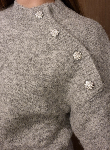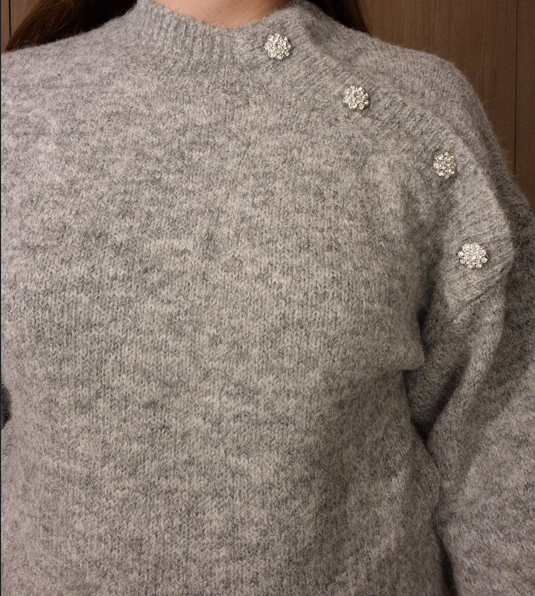Ce pull gris perle allie confort et élégance grâce à sa maille douce et son détail raffiné de boutons bijoux effet perle et strass sur l’épaule. Sa coupe légèrement ample et ses manches ballon apportent une touche moderne et féminine, parfaite pour les looks chics du quotidien.